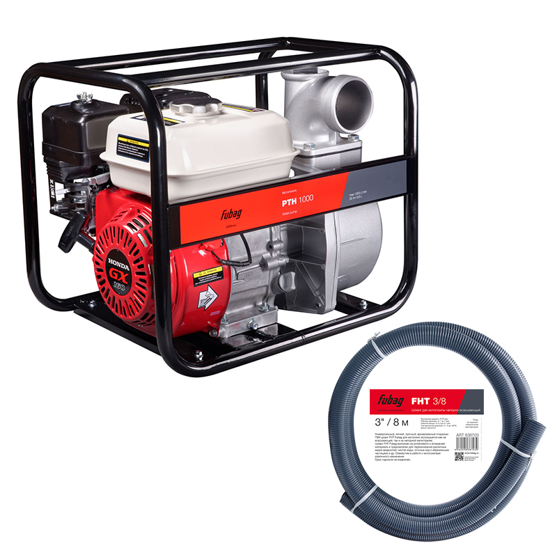 FUBAG PTH 1000 — это бензиновая мотопомпа, предназначенная для перекачивания чистой воды. Конструкция мотопомпы основана на надёжном четырёхтактном двигателе Honda GX 160, что гарантирует стабильную работу и продолжительный ресурс. Прочная металлическая рама выполняет одновременно защитную и транспортировочную функцию, позволяя использовать мотопомпу в полевых условиях, на строительных объектах и в коммунальном хозяйстве.